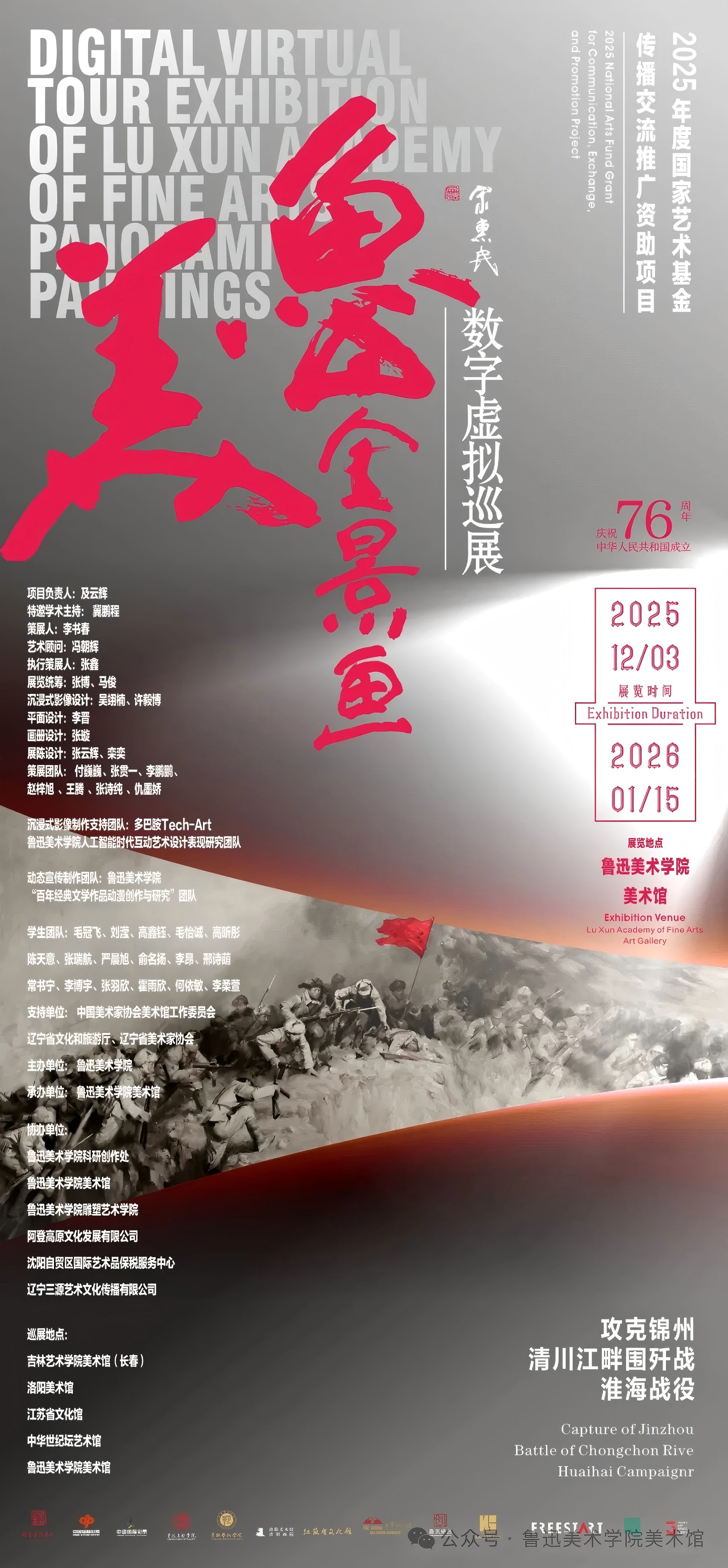 鲁迅美术学院此次携《攻克锦州》《清川江围歼战》《淮海战役》三幅全景画巨制,以数字虚拟沉浸式巡展的形式走向全国,不仅是一次艺术传播的盛举,更是一次对民族集体记忆与艺术经典生命力的深刻唤醒。